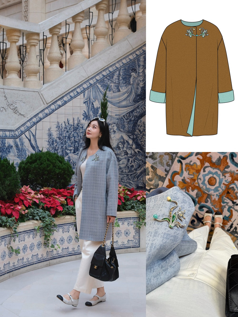 意大利LP品牌100%纯羊绒双面双色卷草花纹盘扣外套