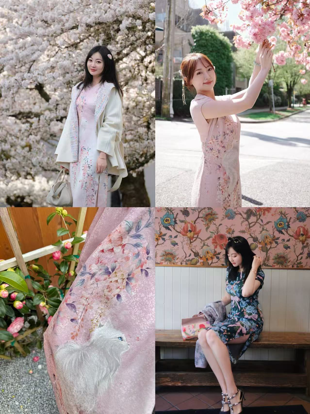 银通吹雪粉紫藤白猫/英国Liberty品牌限量钴蓝蝴蝶结花簇旗袍(双层桑蚕丝)